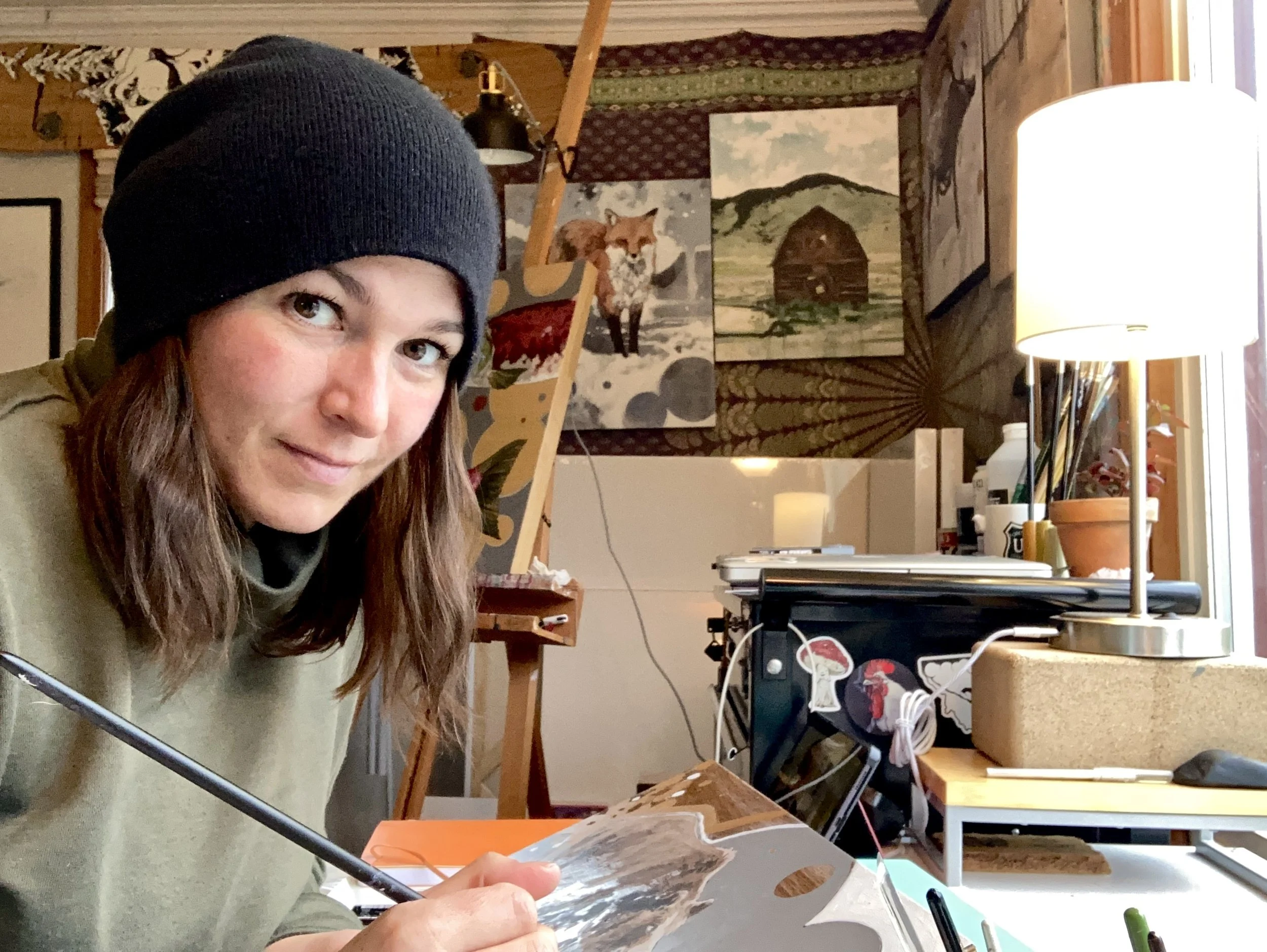 Her primary medium is acrylic paint on either canvas or varnished wood surfaces, but is also prolific in creating works in watercolor as well as graphite drawings on toned paper. For her works on canvas, she waters down the acrylic quite a bit to mimic the way watercolor behaves, and is able to work quickly with the short drying time to add layers and depth. For her works on wood, she loves letting the natural grain of the wood show through as an integral part of the finished piece. Her main subject continues to be wildlife, and she is fortunate to have photographed many of the animals that she uses in her work herself over the years of her travels.